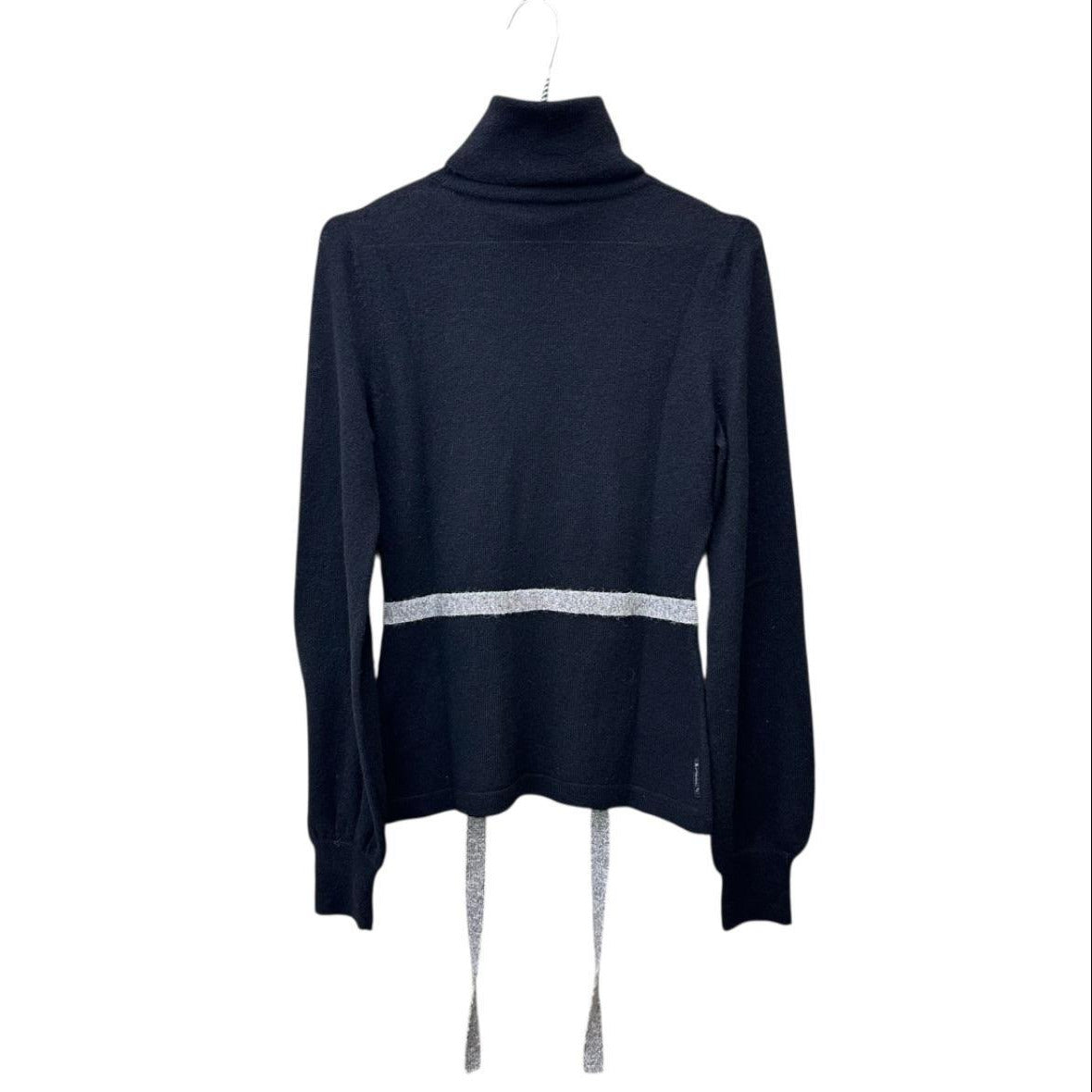 Armani Jeans black turtle neck super soft light knit wool sweater with silver glittery tie waist belt to define the waistline and structured silhouette.