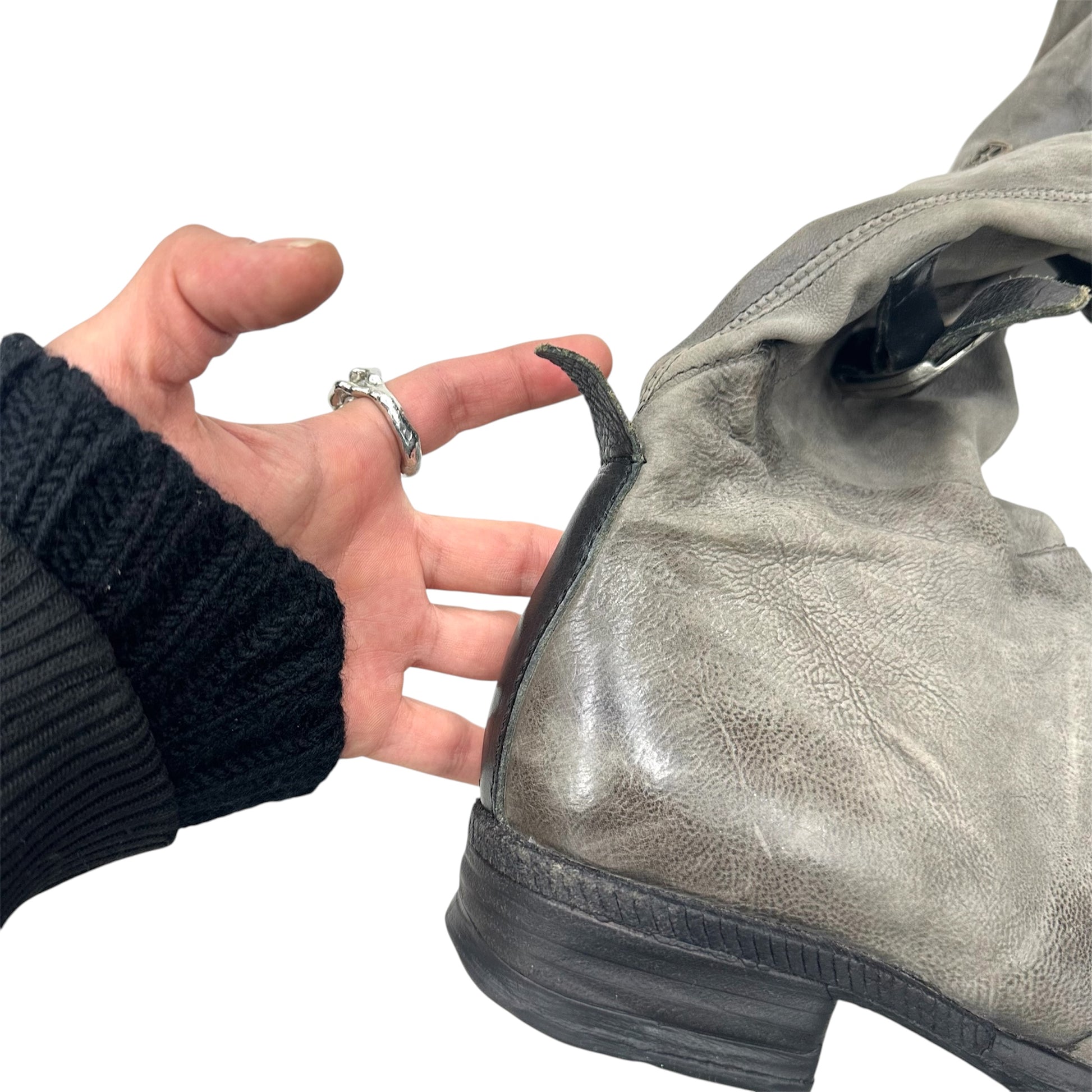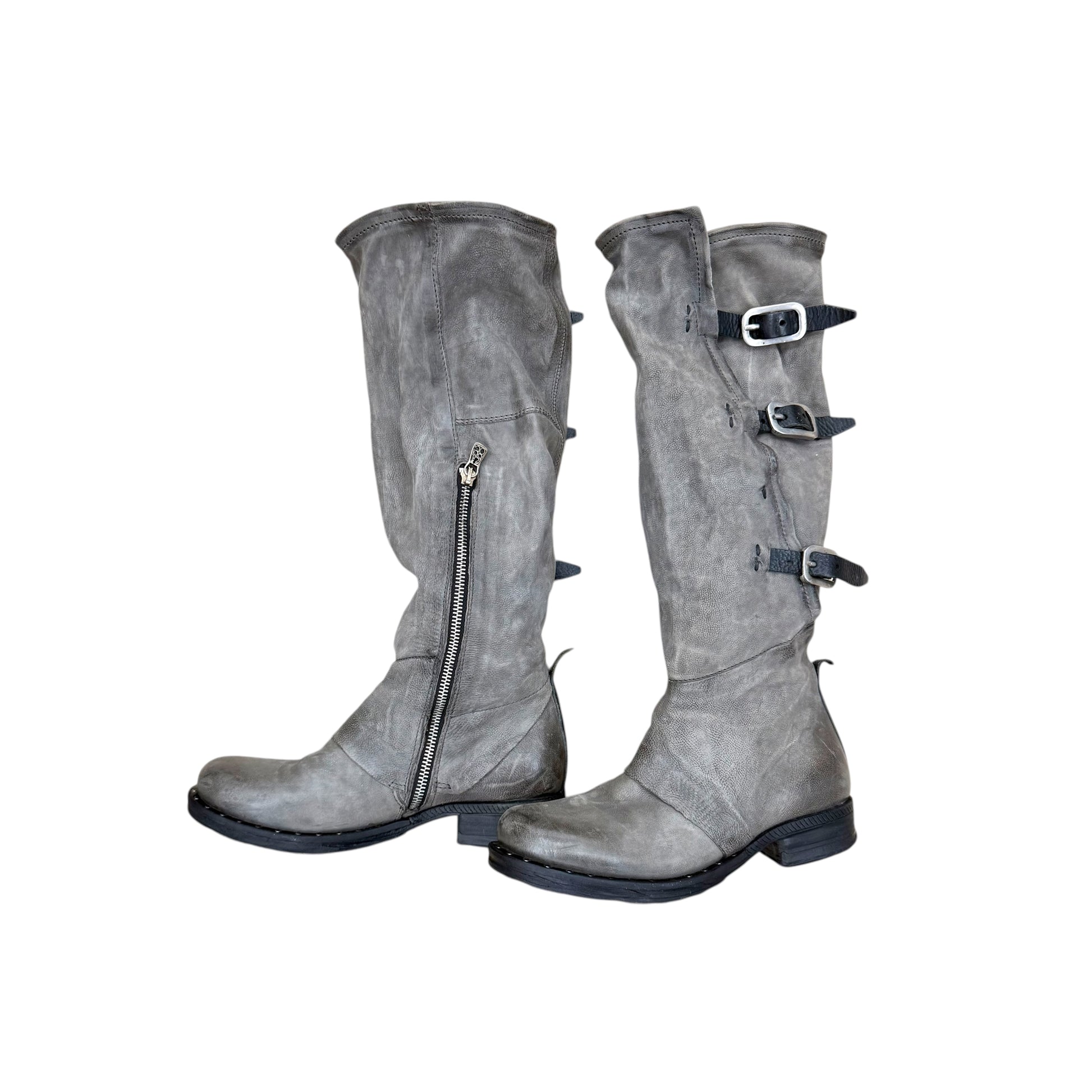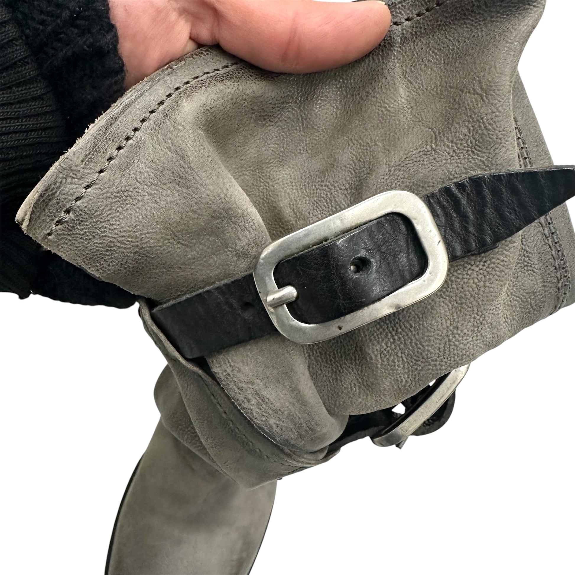 Pair of 90s y2k vintage knee high distressed taupe slouchy high quality leather boots with three buckle details.