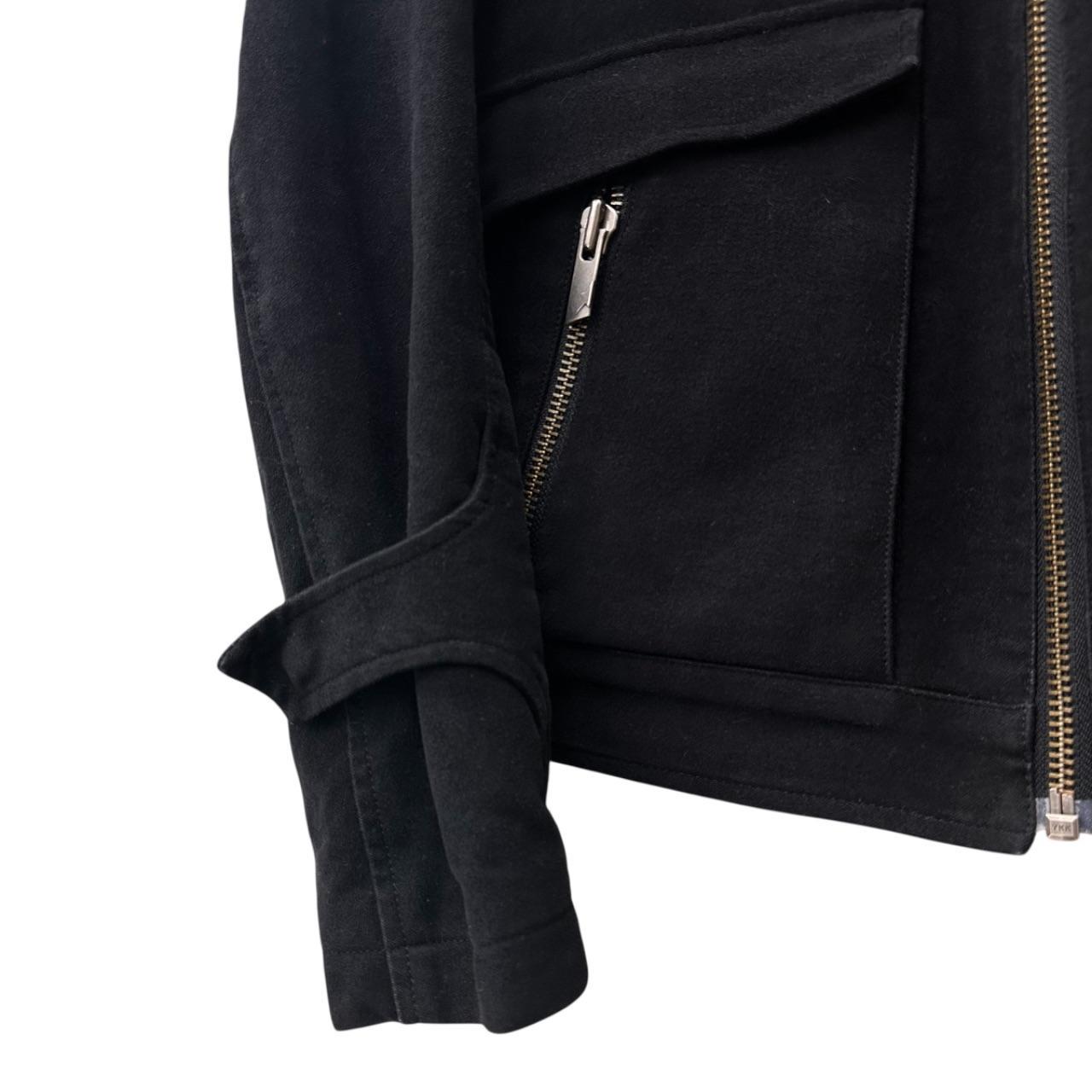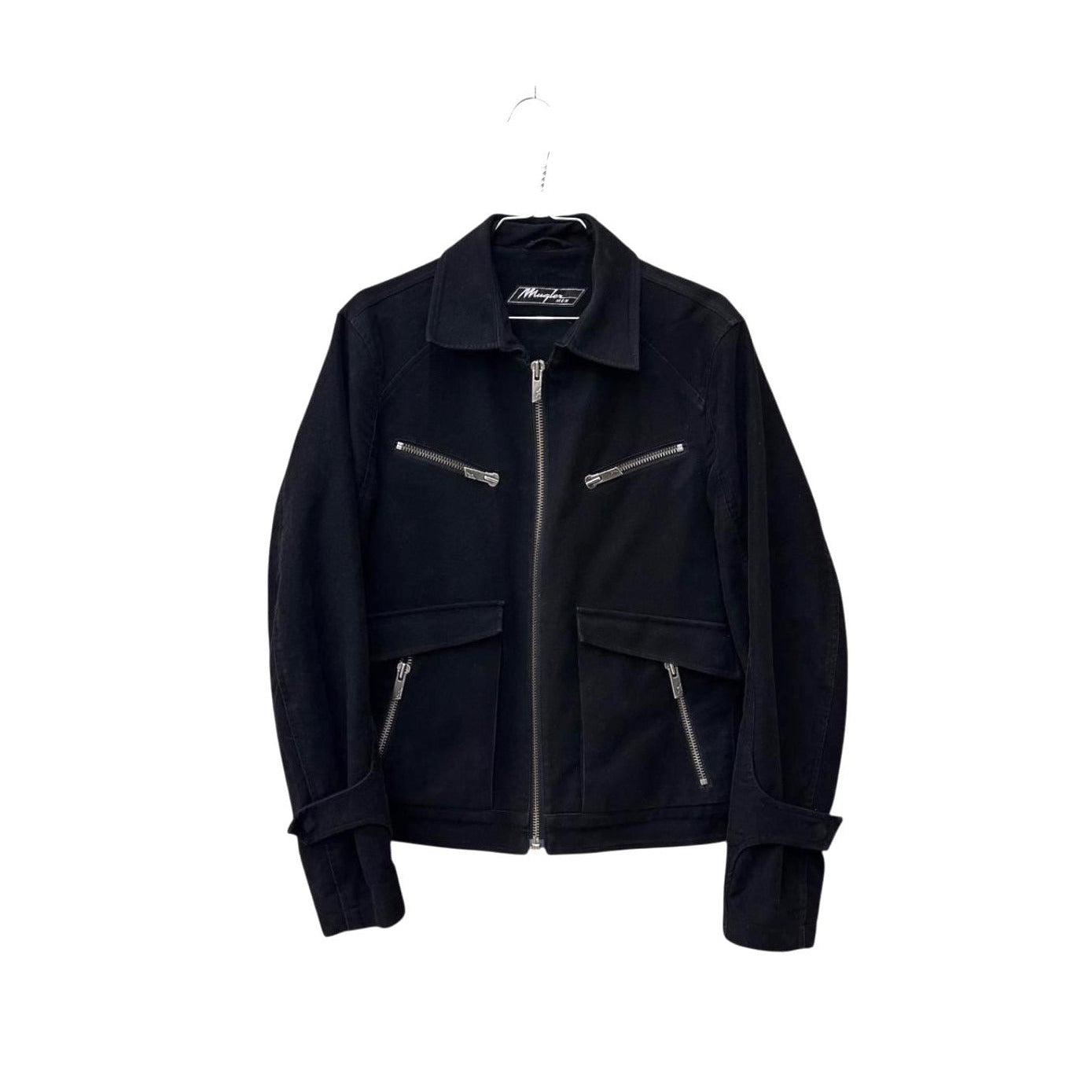 Edgy black Mugler men's cotton bomber jacket with full length central zipper, two zippered breast pockets and two large front flap pockets.