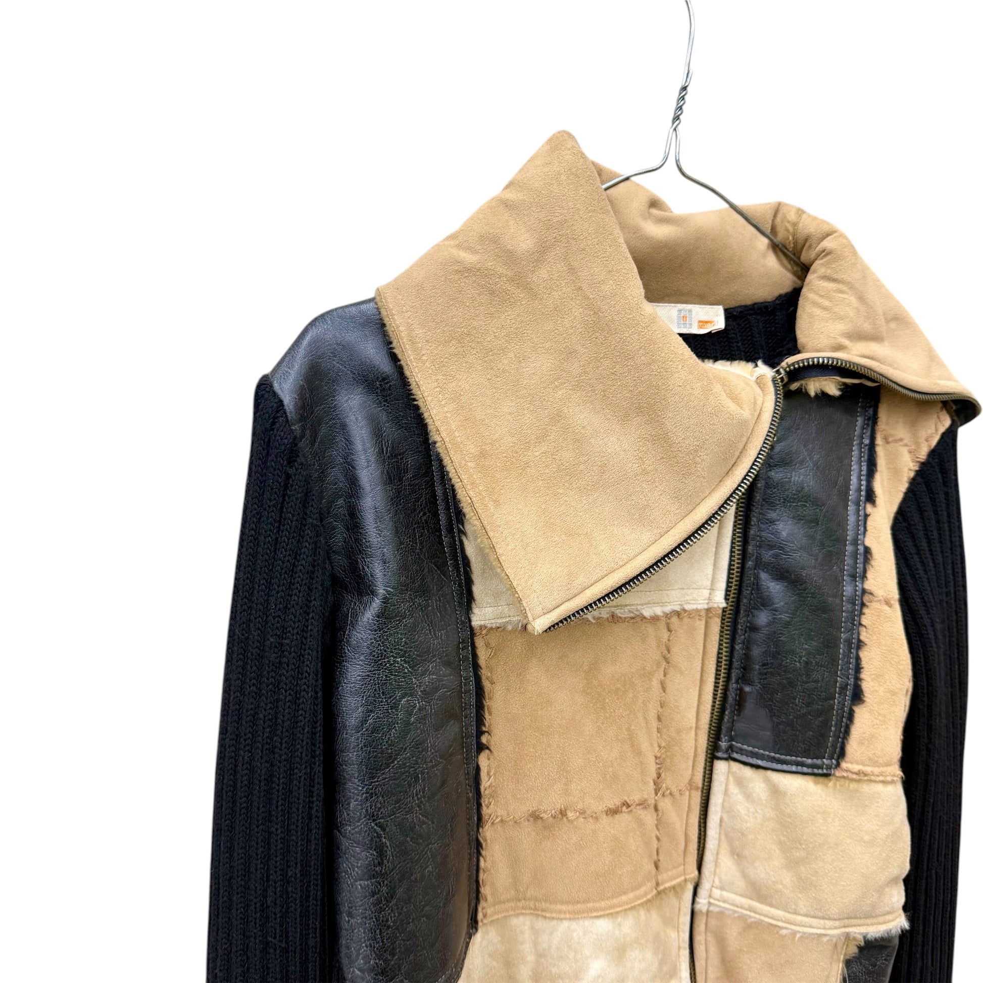 Knit patchwork mixed material black and tan men's zip up cardigan with asymmetric frontal zip closure and high neck.