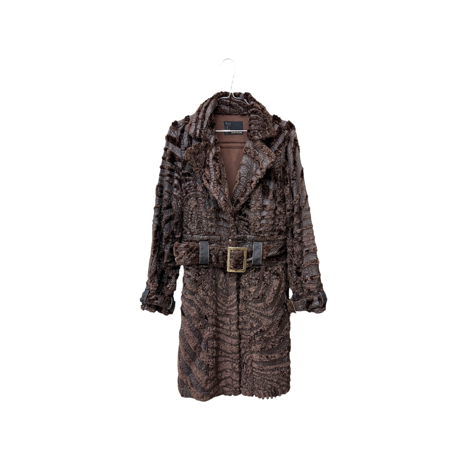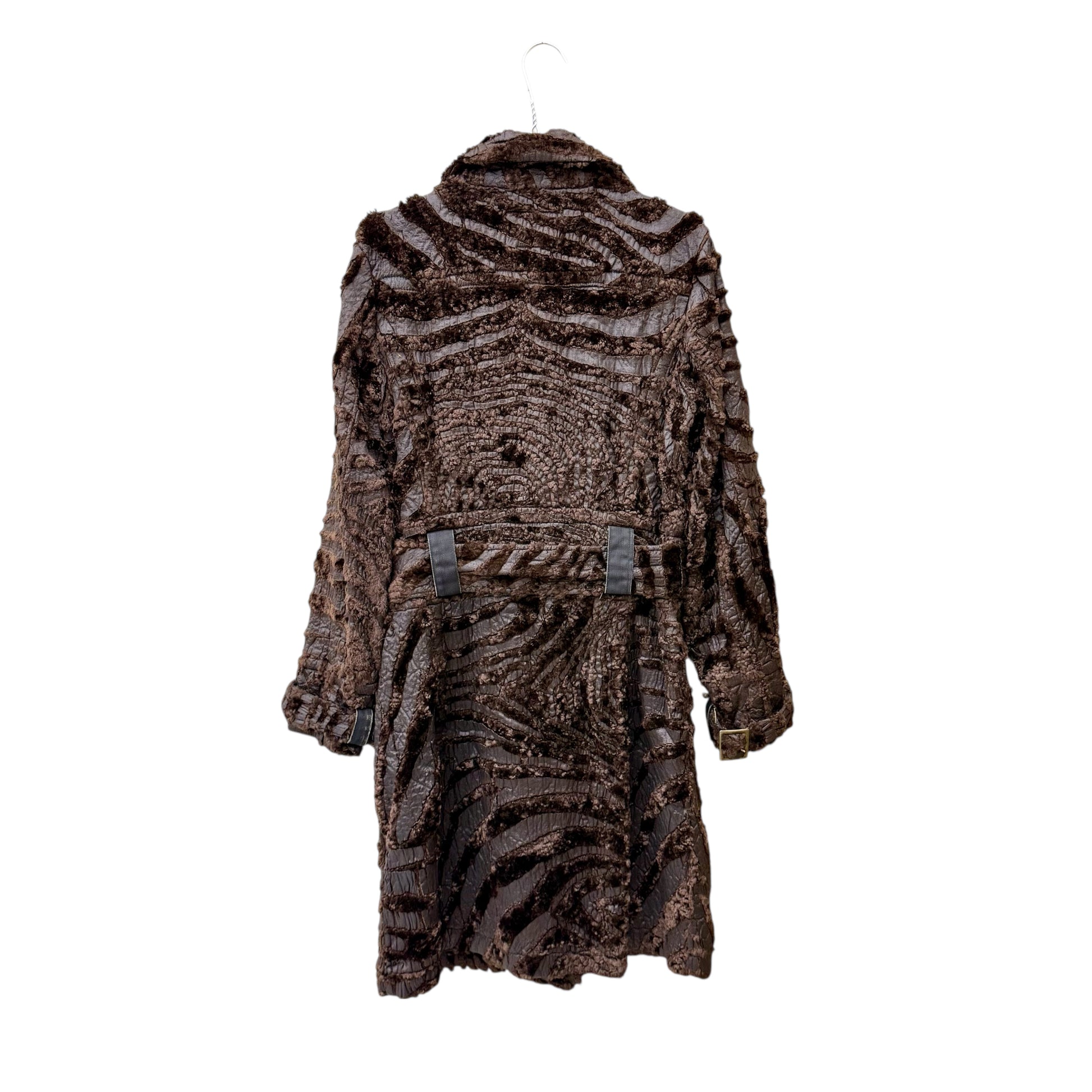 Vintage brown half length tight swirled rippled textured trench coat with notched lapels and belted waist buckled cuffs and contrasting dark panels of waxed fabric.