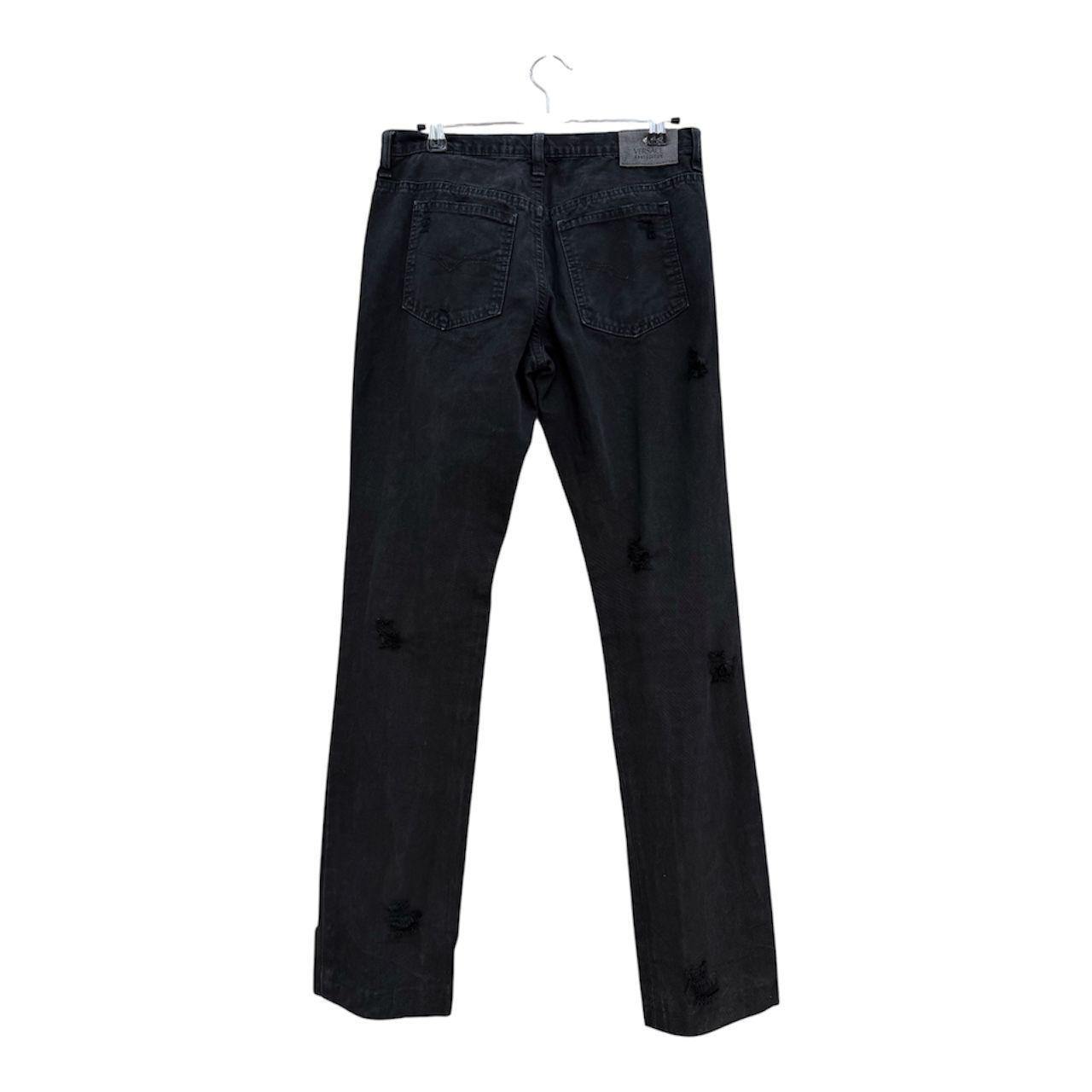 Versace Jeans Couture dark grey stonewash jeans with silver chain leg. Mid-rise, straight leg, logo detailed button and pocket details.